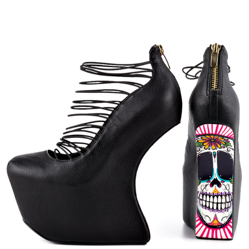 These shoes have a fun and spooky floral skull print. They are easy to walk in because of the wedge heel. You can wear them with a skeleton, ghost bride, doll, or dark fairy costume. They are cute, comfy, and perfect for your Halloween party.